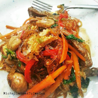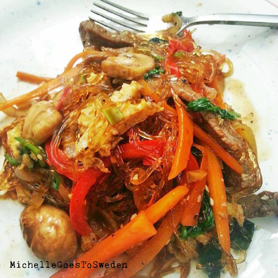 BTW What is Japchae: It is one of Korea’s best-loved dishes, with glass noodles, stir fried with vegetables and meat. Yummy! It easy to make!!